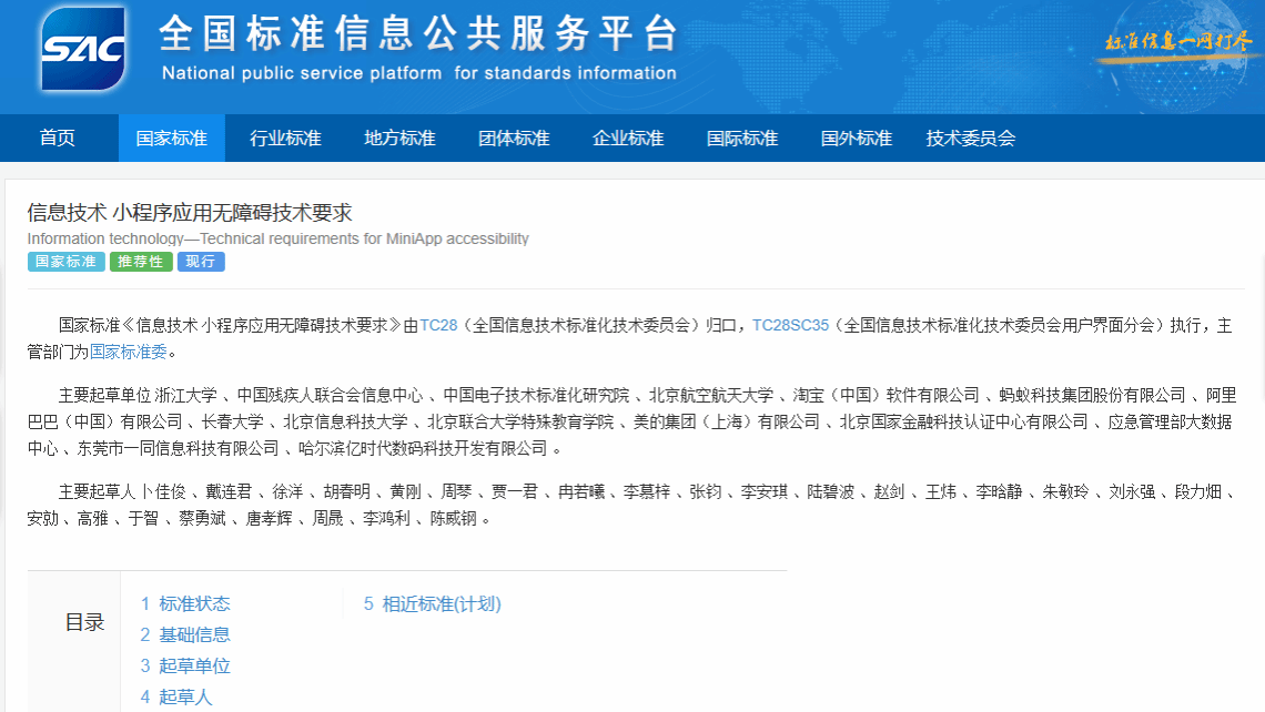 近日,国家标准《信息技术 小程序应用无障碍技术要求》(GB/T 45395—2025,以下简称《技术要求》)在全国标准信息公共服务平台发布。我校作为起草单位参与了标准的组织、撰写与技术框架设计工作。