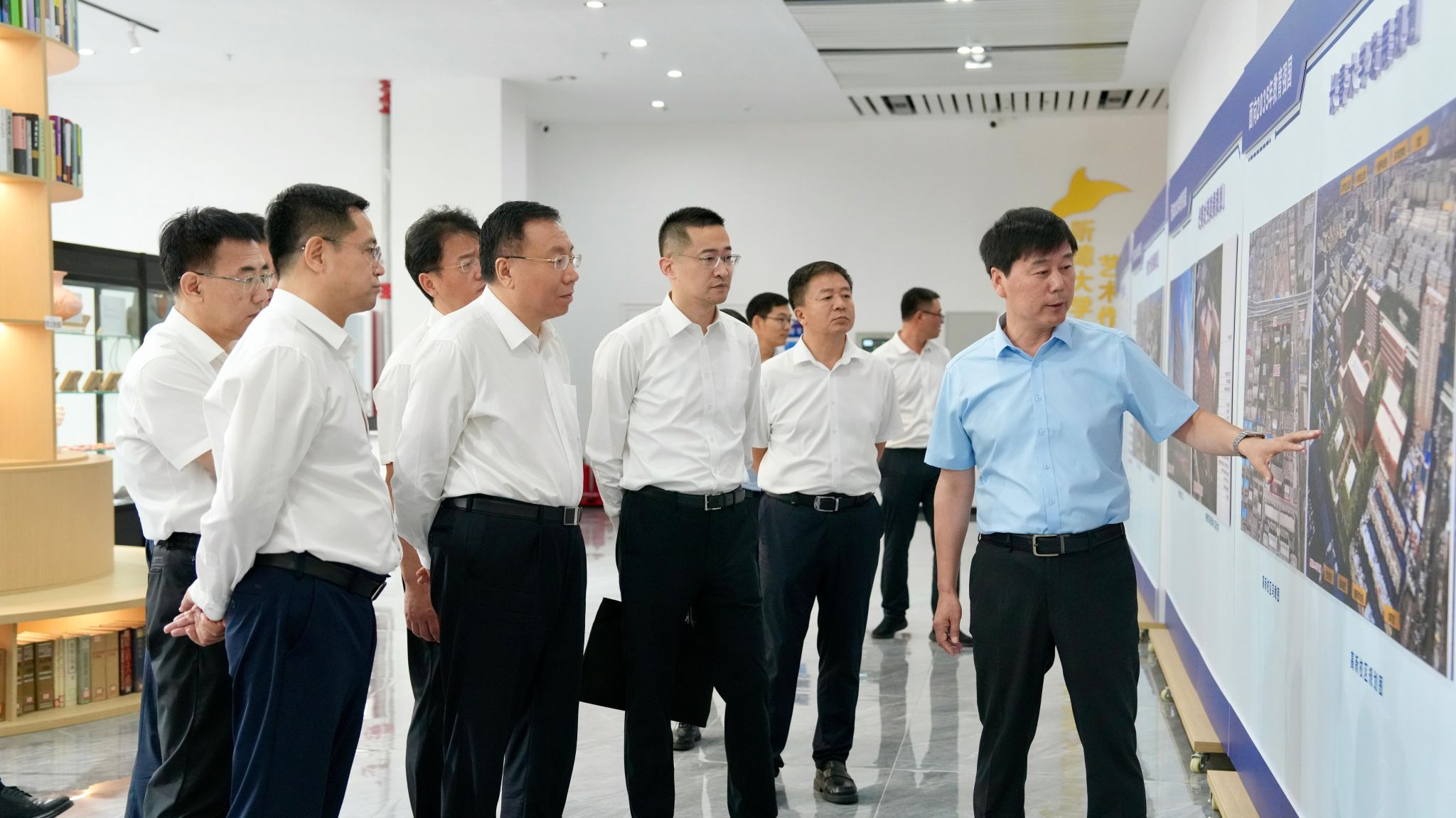 在图书馆一楼大厅,郭灵计听取了关于学校东校区新建项目、西校区规划建设情况汇报。