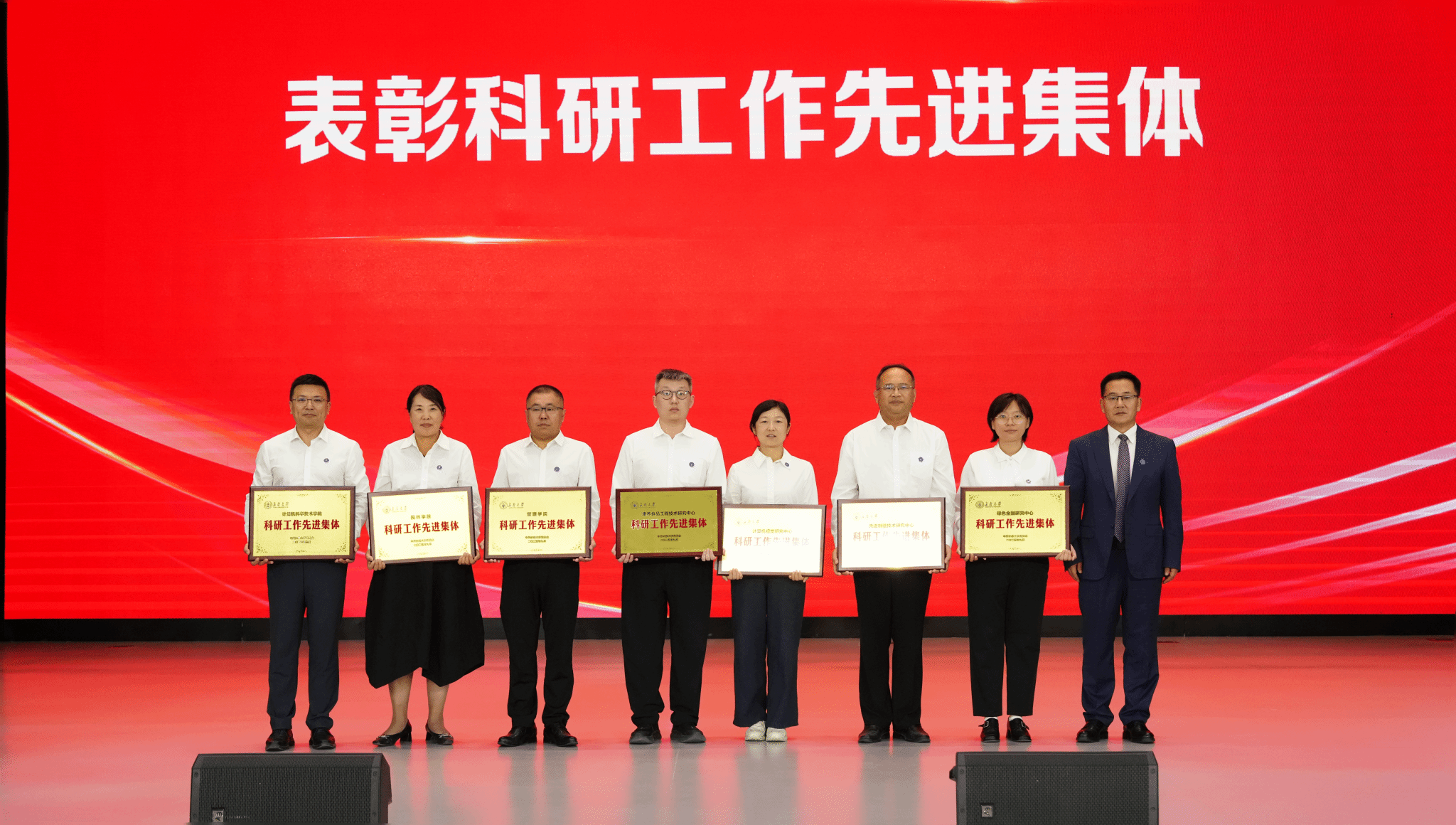 副校长孙大文为科研工作先进集体获奖代表颁发荣誉奖牌。