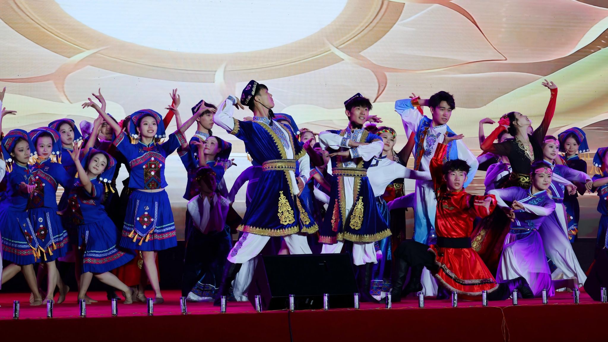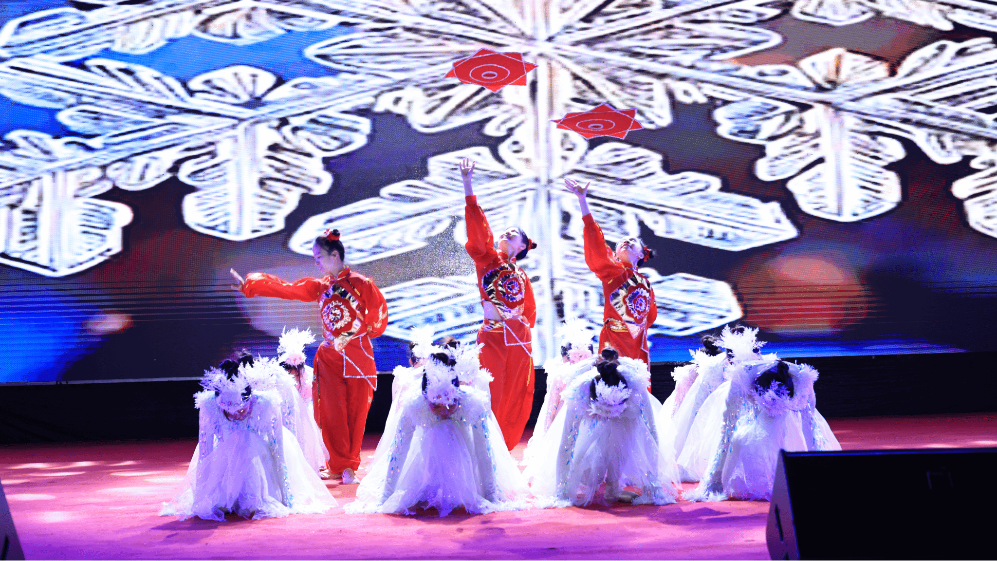 晚会节目巧妙融合思想教育、励志与学风元素。管乐合奏《世纪序曲》铿锵开场;舞蹈《风华盛放》展现青春团结;各学院歌曲联唱《爱》《遇见》《我的未来不是梦》用方言迎新生;群口相声《我爱学习》幽默解读学习生活;小合唱《每当我走过老师窗前》《爱永在》感怀师恩;舞蹈《狼图腾》节奏鲜明、场面震撼;阿卡贝拉《追光者》展现了视障学子昂扬的精神面貌;诗歌朗诵原创作品《脚走出来的路》深情回顾学校发展历程与“团风”精神;舞蹈《白山黑水铸英魂》通过艺术形式缅怀先烈;优秀校友合奏《勇敢的心》,让激情与信念在舞台上回响;独唱《是你一直想着我》深情讴歌了党的使命担当与人民情怀;听障学生带来的舞蹈《雾凇之恋》用肢体语言展现雾凇的灵动、纯净与壮丽;歌舞《领航》以激昂旋律与动人演绎,将气氛推向高潮,勉励新生勇往直前。