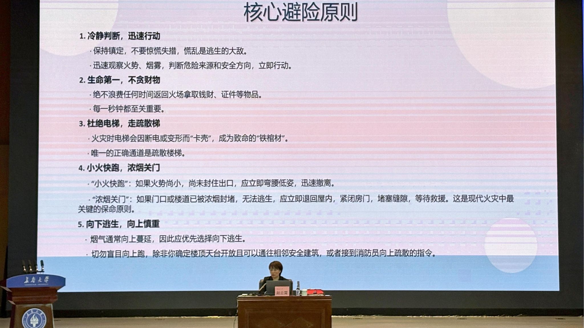赵云霄结合真实案例与专业课件,从心搏骤停急救、气道异物梗阻处理、烧烫伤与冻伤应对、创伤急救及火场避险等四个方面展开讲解。在心搏骤停急救环节,赵云霄详细阐释了“黄金四分钟”的重要意义,并通过规范演示,系统传授了心肺复苏操作流程;在气道异物梗阻急救环节,赵云霄重点演示了海姆立克急救法的操作要领;培训涵盖烧烫伤“冲、脱、泡、盖、送”五字原则、冻伤复温禁忌、创伤止血包扎固定转运四大技术,以及火场“小火快跑、浓烟关门”的核心避险策略与具体逃生技巧,内容全面覆盖校园及日常生活中可能遭遇的突发状况。