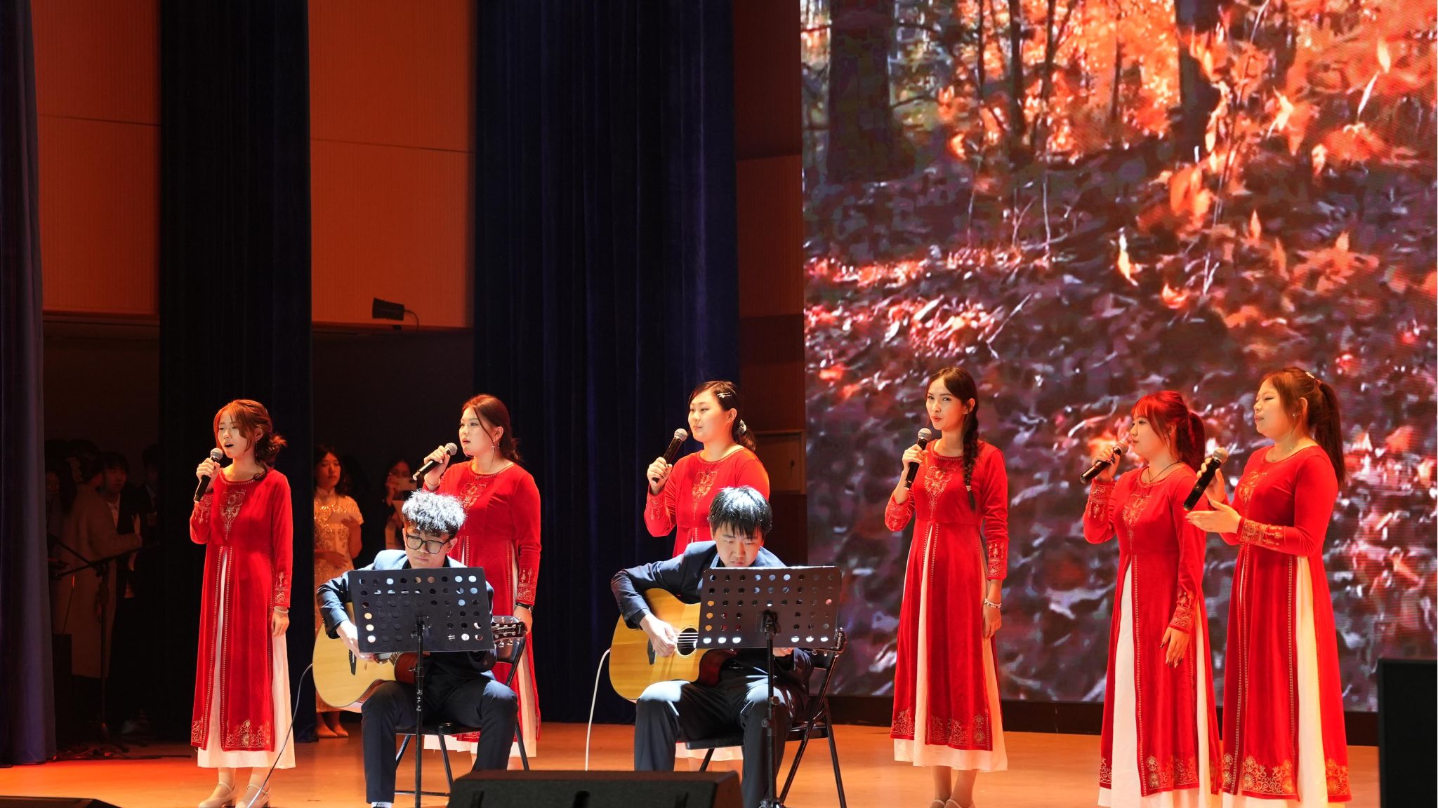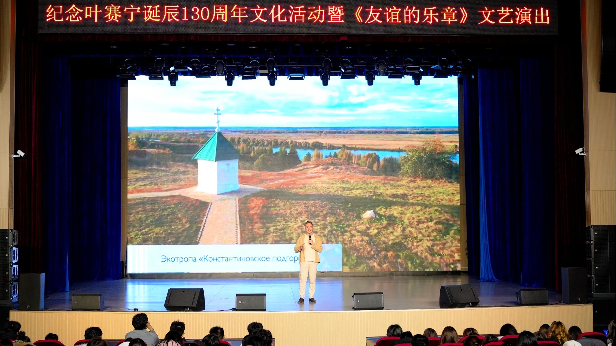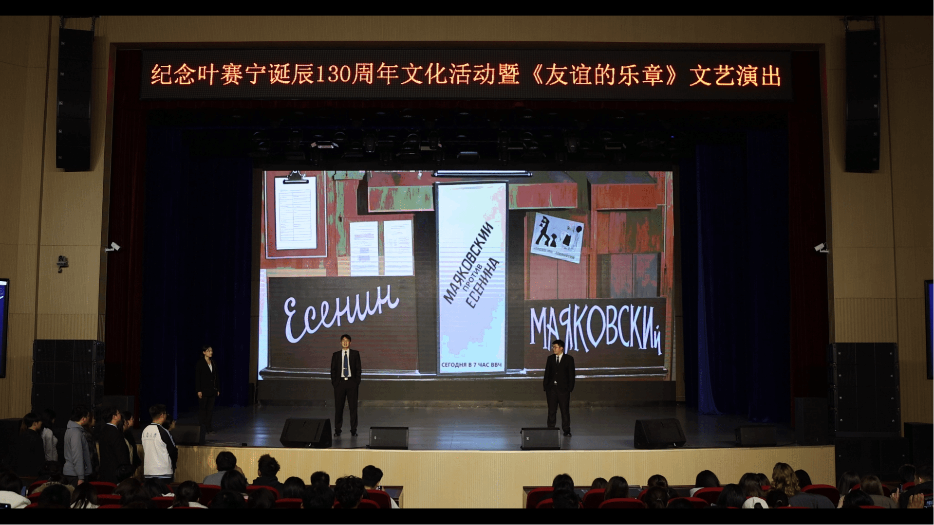 26日下午,学校举办《友谊的乐章》文艺演出,演出以“诗与歌——友谊的桥梁”为主题,分为上下两个篇章。上半场由“拉杜尼察”艺术团带来《金色的丛林已不再说话》、《库帕拉节》、《巴拉莱卡琴》、《萨马拉歌谣》、《窗前明月》、《毡靴》等经典诗歌演唱与民谣表演,生动展现了叶赛宁诗歌在音乐中的多样表达与俄罗斯民间艺术的独特魅力。下半场为中俄学生联袂演出,话剧《诗歌对决》以戏剧形式呈现叶赛宁与马雅可夫斯基的文学对话,折射出二十世纪初俄罗斯诗坛的思想碰撞;随后,中俄学生共同合唱《明天的幸福鸟》,表达了两国青年对和平与未来的共同向往。最后,民乐合奏《新赛马》与《金蛇狂舞》以激昂的节奏与中国传统乐韵为整场演出画上圆满句号。