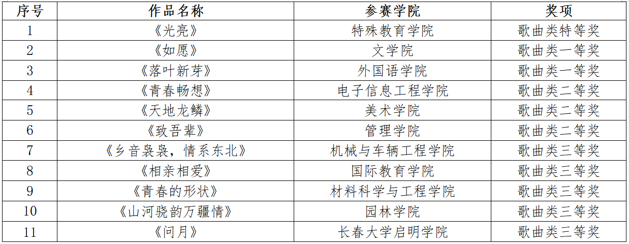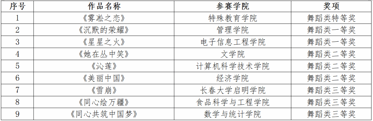 为切实提升学生美育素养,增强美育成效,引导学生在艺术实践中陶冶高雅情操,充分发挥第二课堂与第一课堂协同育人作用,近日,学校举办“‘团风’领航筑梦·青春砥砺前行”第十四届大学生艺术展演歌曲、舞蹈大赛决赛。经过激烈角逐与专业评审,特殊教育学院歌曲《光亮》、舞蹈《雾凇之恋》获特等奖;文学院歌曲《如愿》、管理学院舞蹈《沉默的荣耀》等4项作品获一等奖;电子信息工程学院歌曲《青春畅想》、计算机科学技术学院舞蹈《沁莲》等6项作品获二等奖;机械与车辆工程学院歌曲《乡音袅袅,情系东北》、长春大学启明学院舞蹈《雪崩》等8项作品获三等奖。