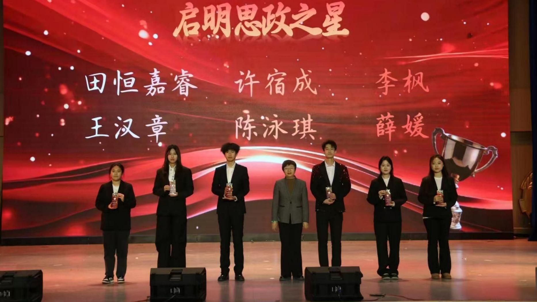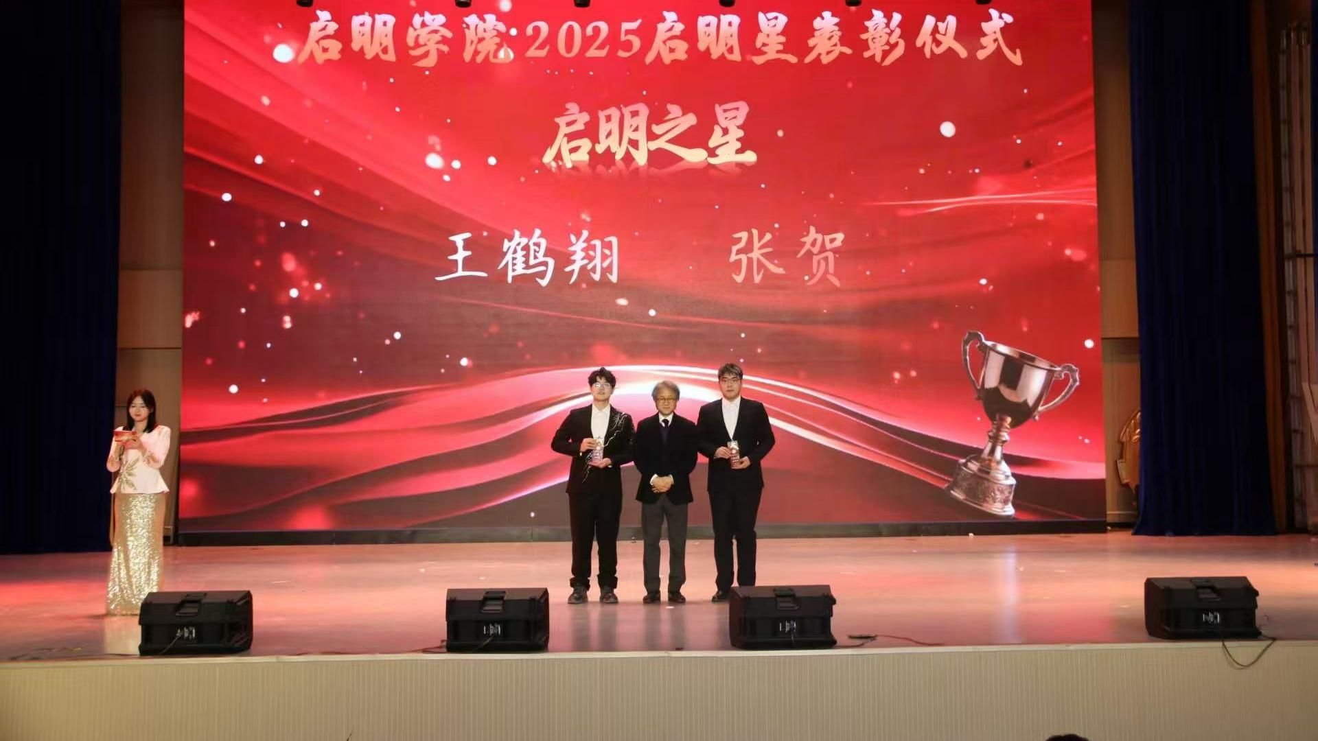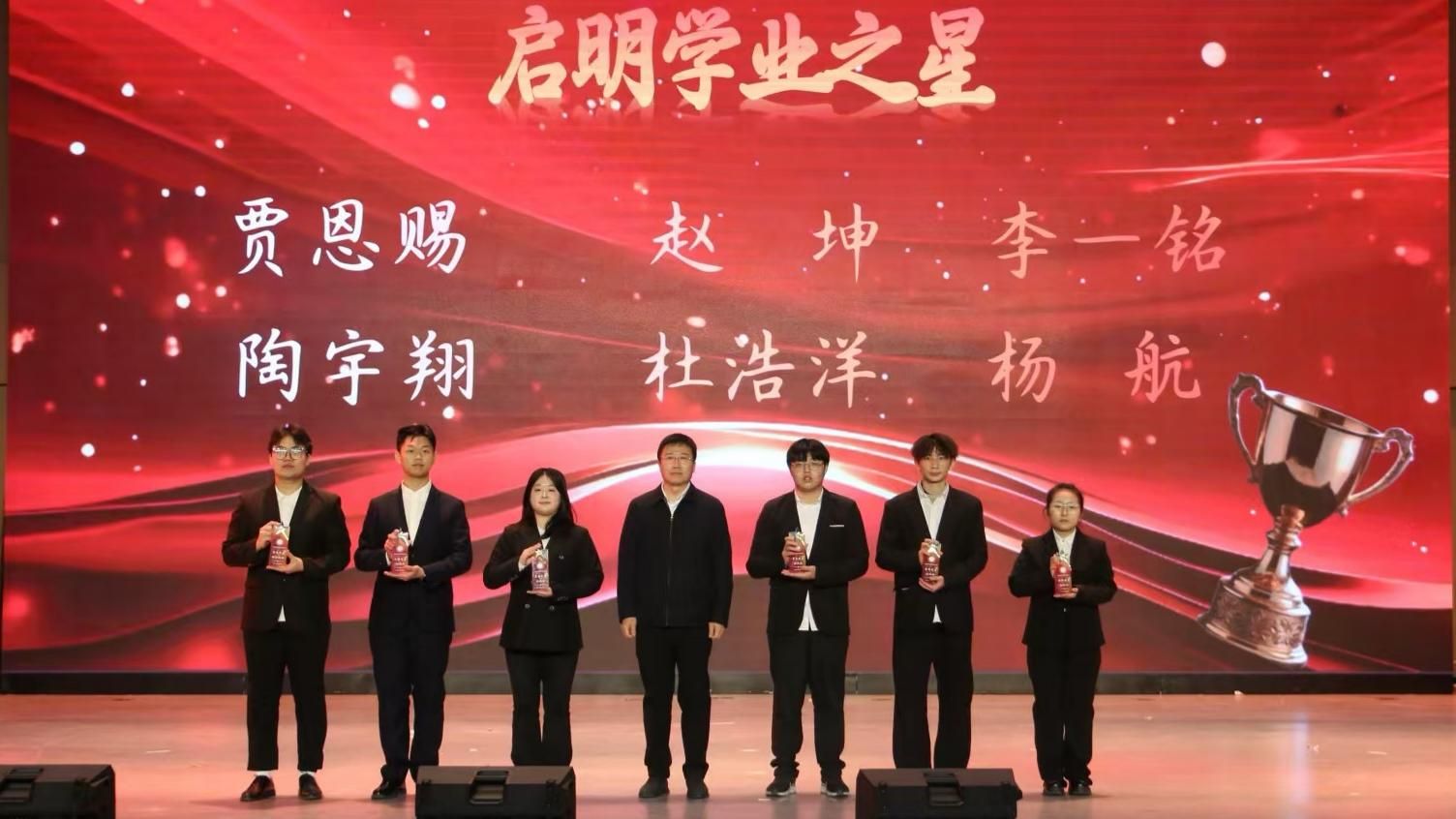 在表彰环节,与会嘉宾为获得“启明思政之星”“启明学业之星”“启明创新之星”“启明文体之星”等6类奖项的32名学生颁发了奖杯和证书。