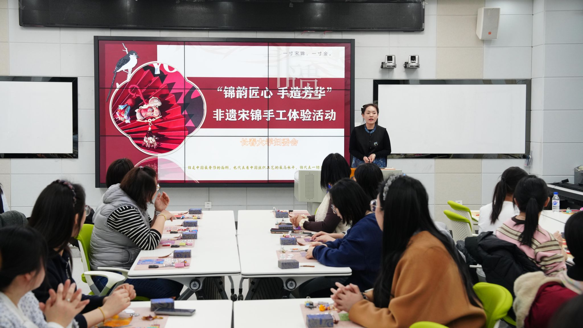 活动现场,非遗宋锦资深专家沈月老师以“理论+实践”相结合的方式,涵盖专题讲座、技艺体验、成果展示三大板块,让教职工在指尖流转的经纬丝线中,感受传统艺术带来的宁静与喜悦。