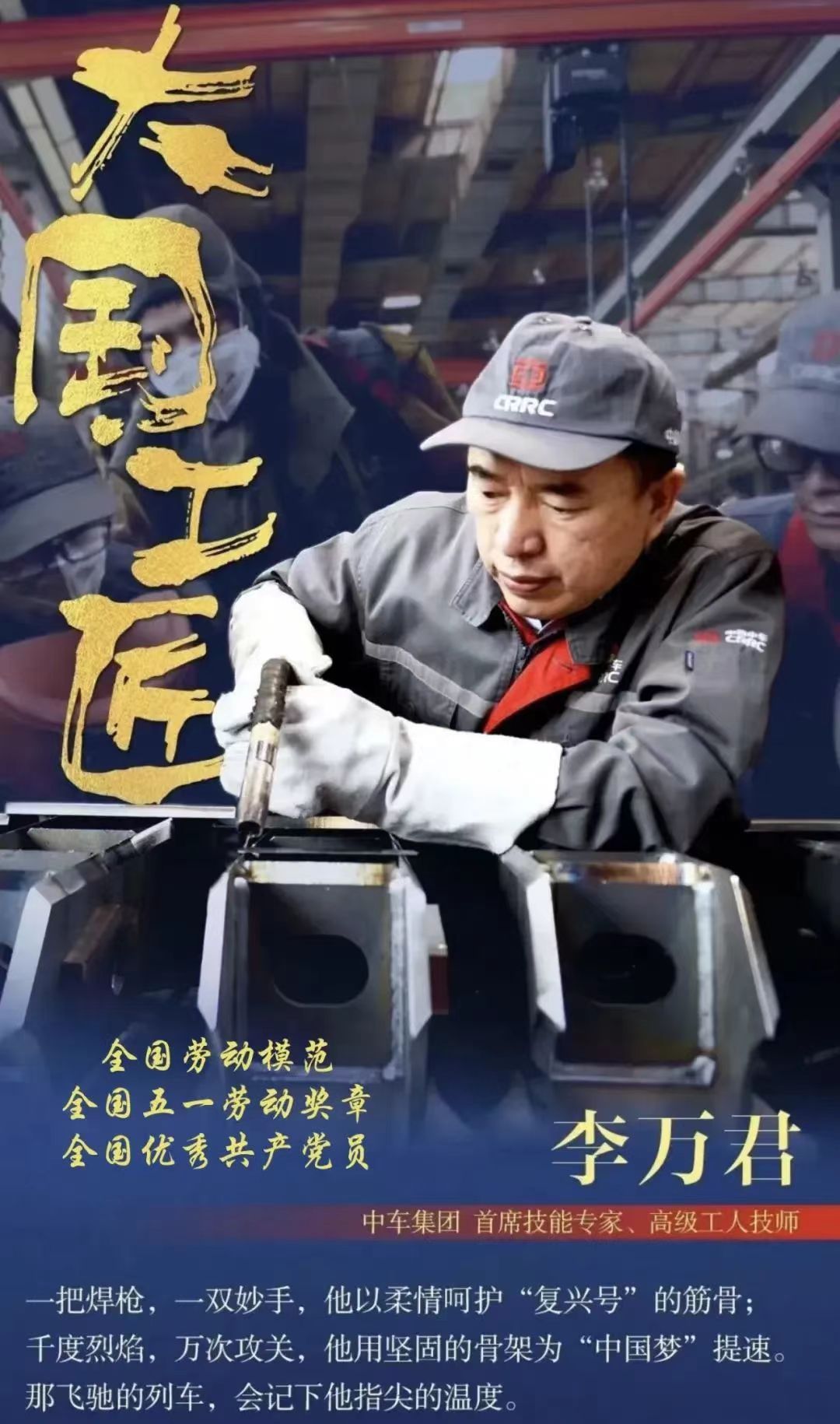 李万君,男,汉族,共产党员,1987年在原长春客车厂参加工作,现为中车长春轨道客车股份有限公司转向架事业部焊接产线组电焊工,高级工人技师,首席操作师,拥有碳钢、不锈钢焊接等12项国际焊工资格证书和国际焊接技师证书。凭着对党的忠诚和对企业的挚爱,他从一名普通焊工成长为我国高铁焊接专家,主持的焊工首席操作师工作室,被国家劳动部授予“李万君大师工作室”,被中华全国总工会命名为“全国示范性劳模创新工作室”,先后组织培训800多场,为公司培训焊工2万多人次,组织公司职工考取各种国际、国内焊工资质证书8000余项,总结并制定“环口焊接七步操作法”等52种转向架焊接规范及操作方法,技术攻关150余项,其中50项获得国家专利,满足了高速动车组、城铁车、出口车等20多种车型的生产需要,代表了中国轨道车辆转向架焊接的世界最高水平。先后荣获“全国劳动模范”“全国五一劳动奖章”“全国优秀共产党员”“中华技能大奖”“中央企业技术能手”“全国技术能手”“吉林省特等劳模”“吉林省高级专家”“长春市特等劳模”等几十项国家和省市荣誉称号,享受国务院政府津贴,被评为2016年度感动中国十大人物,2019年获得全国首批"大国工匠",曾多次受到习近平总书记的接见,是党的十八大、十九大代表,新时期我国技术工人的杰出典范。兼任吉林省总工会副主席和中国中车工会副主席。
