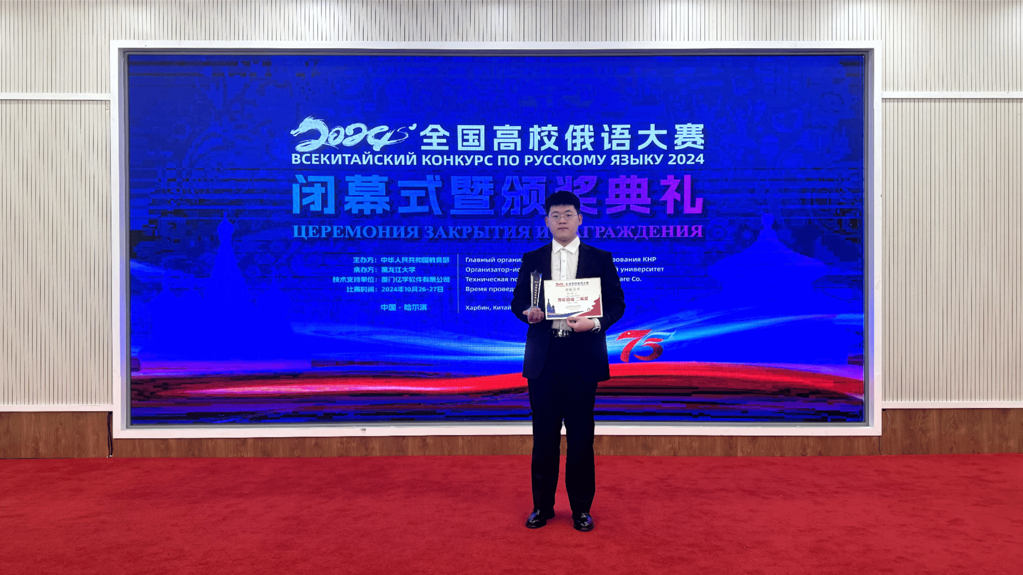 10月25日-27日,由教育部国际合作与交流司主办、黑龙江大学承办的2024年全国高校俄语大赛在哈尔滨市举行。我校外国语学院学生周凡棋荣获大赛二等奖,这是我校学生参加此项赛事以来取得的最好成绩。