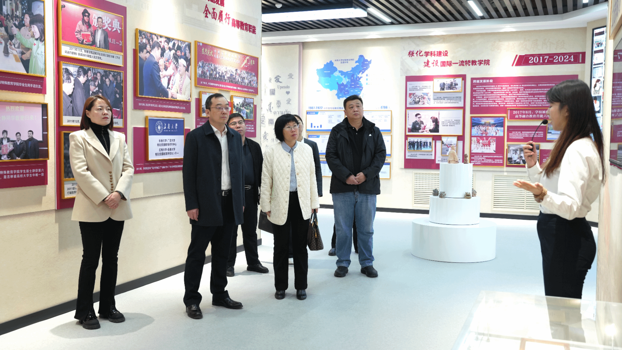 会后,夏艳霞一行参观了党员宣誓广场、校史馆、特殊教育学院师生艺术作品展,详细了解了学校党建思政、历史沿革、办学精神、办学特色、人才培养、文化建设等情况。