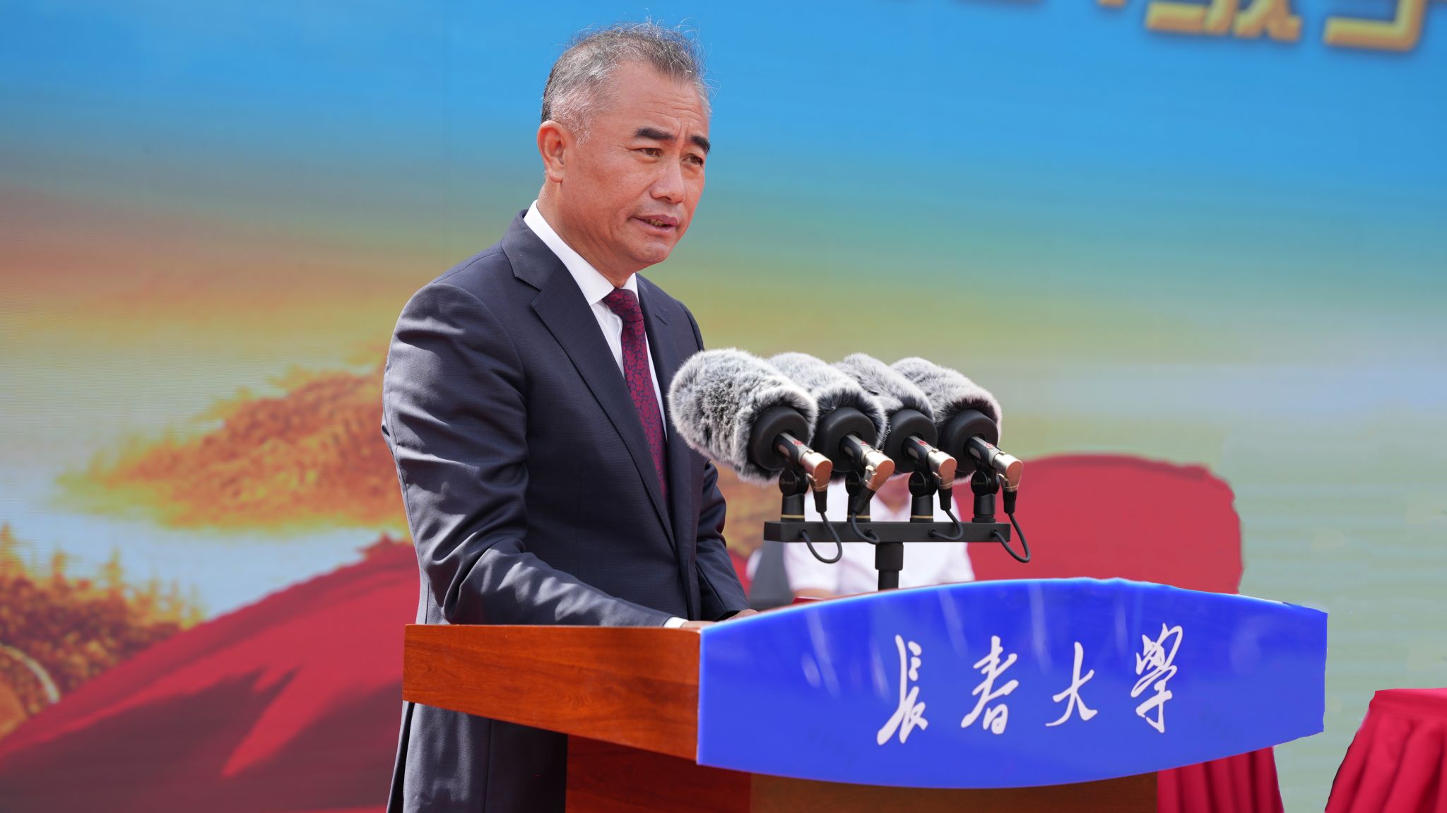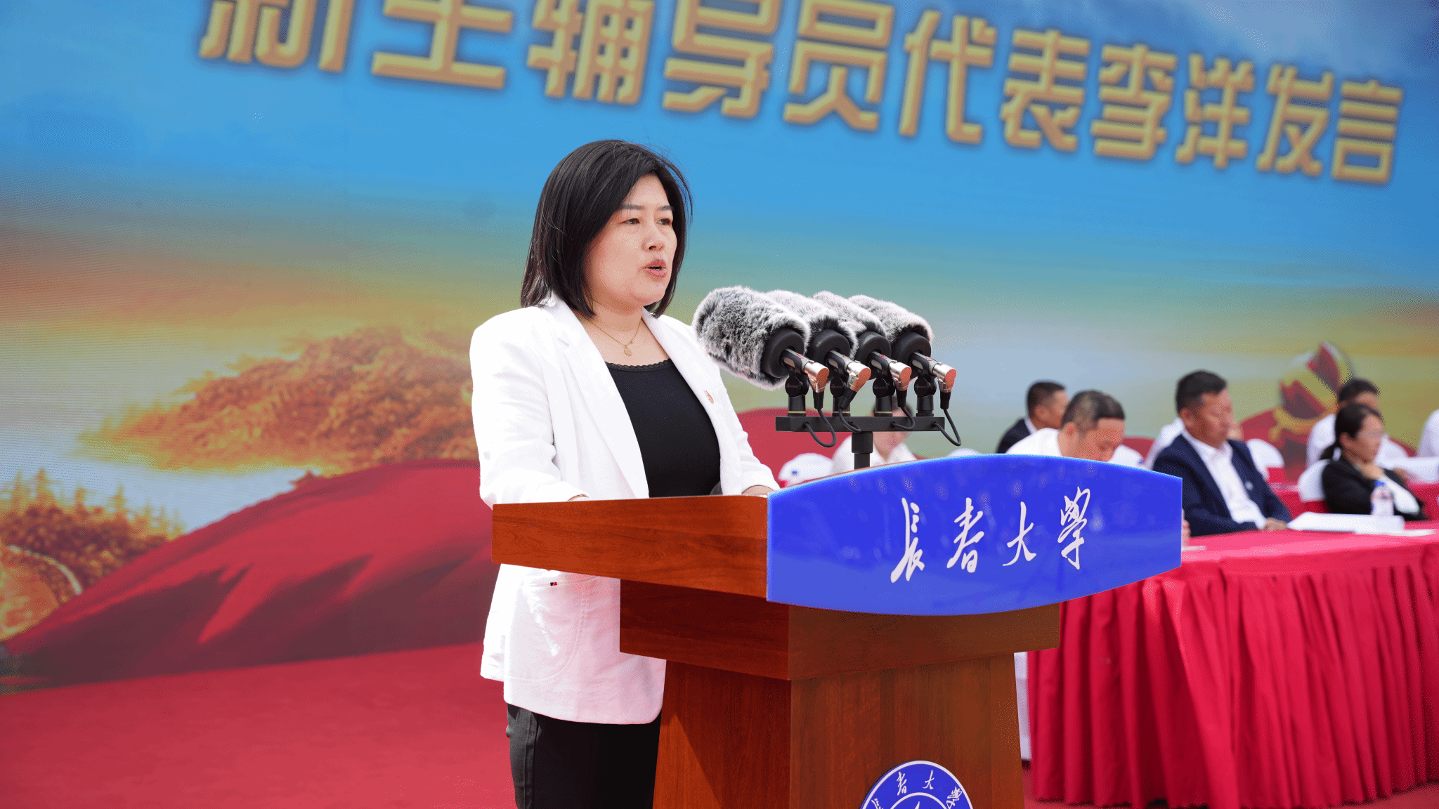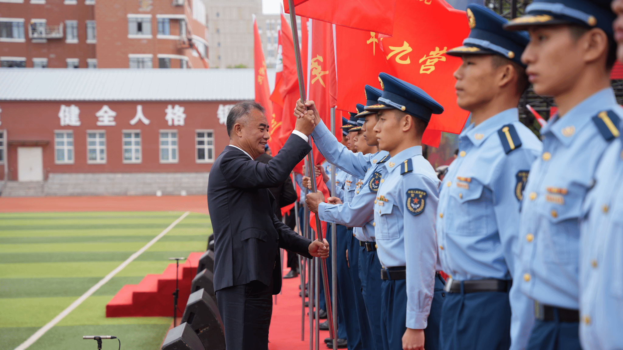 王剑飞为各军训营授旗并作动员讲话,希望2024级新生、军训教官和全体人员,一是要认真参训、听从指挥,高质量完成军训任务。要严守纪律、刻苦训练,以优异的训练成果展现2024级同学们的青春风采;二是要扛牢责任、认真训练,高标准落实军训计划。全体教官要做到科学组训、按纲施训;全体辅导员要深入训练一线,了解学生的思想和心理状况;武装部要做好协调组织工作,对训练进行详细的安排和部署;三是要团结一致、密切协作,高水平确保军训顺利。校团委要利用课余时间,设计丰富多彩的文体活动;心理健康教育中心要了解掌握学生军训期间心理健康状态,做好心理疏导;校医院要做好学生医疗保障,要派专人在场地值班值守;安全处要做好军训期间交通安全、消防演练全保障;后勤保障处要做好饮食安全、军训教官住宿保障等工作,确保2024级军训工作圆满完成。