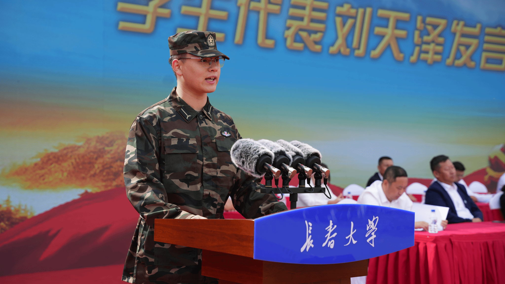 大会上,徐铭泽代表承训教官发言,他表示在接下来的军训中,将以身作则、严守纪律、科学施训、全力以赴,确保军训高效、有序进行,让同学们在军训中收获自信、收获友谊、收获成长;管理学院学生刘天泽代表全体参训新生承诺,积极配合教官的工作,以饱满的热情和昂扬的斗志投入到每一次训练中,努力完成军训各项任务要求;辅导员代表李洋寄语学生,希望同学们“立正”身心,铸就强健体魄、“看齐”英雄,练就过硬本领、“敬礼”军人,造就强大国防、“集合”力量,成就伟大梦想;张航宣读了教官分配情况。