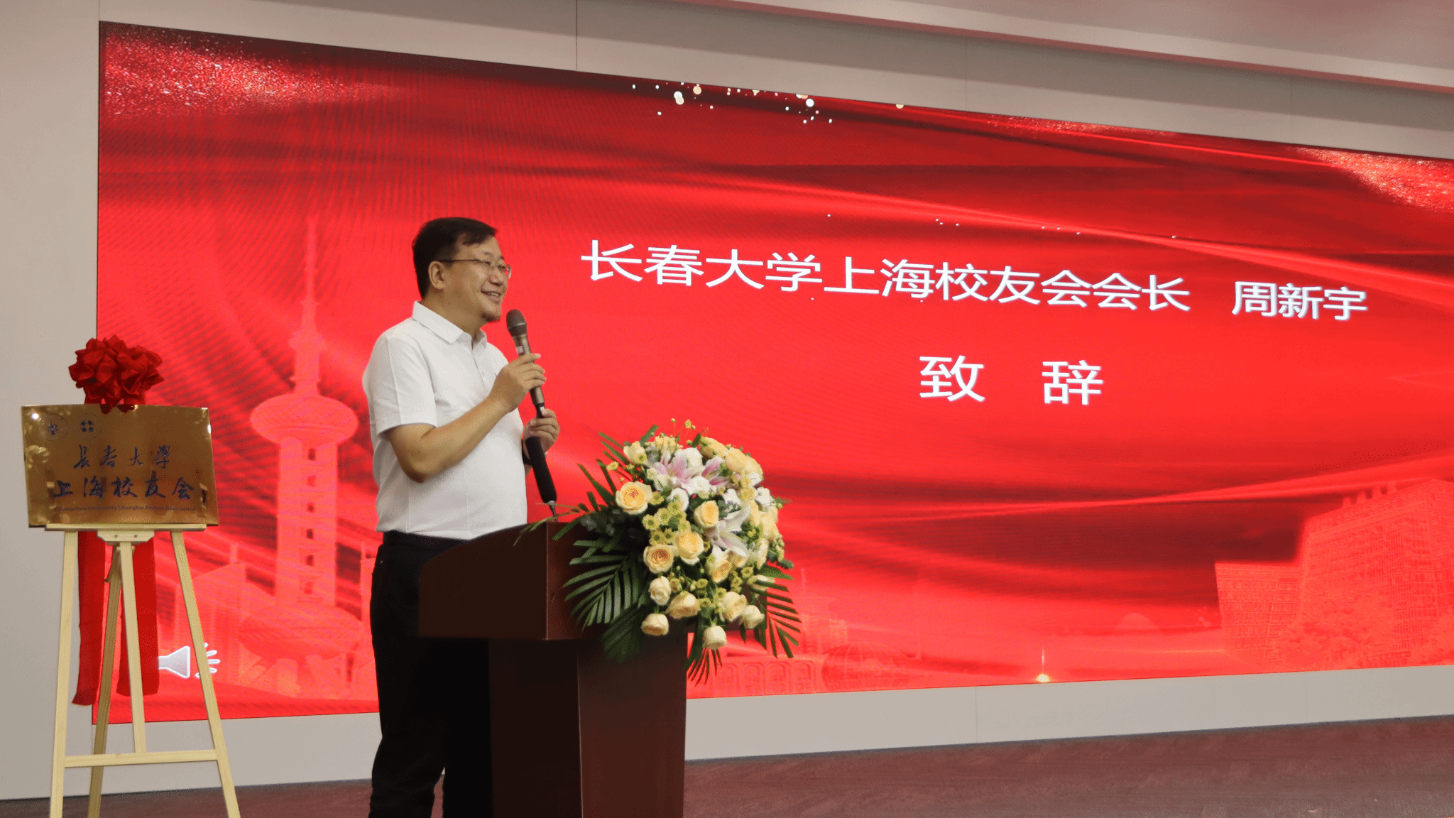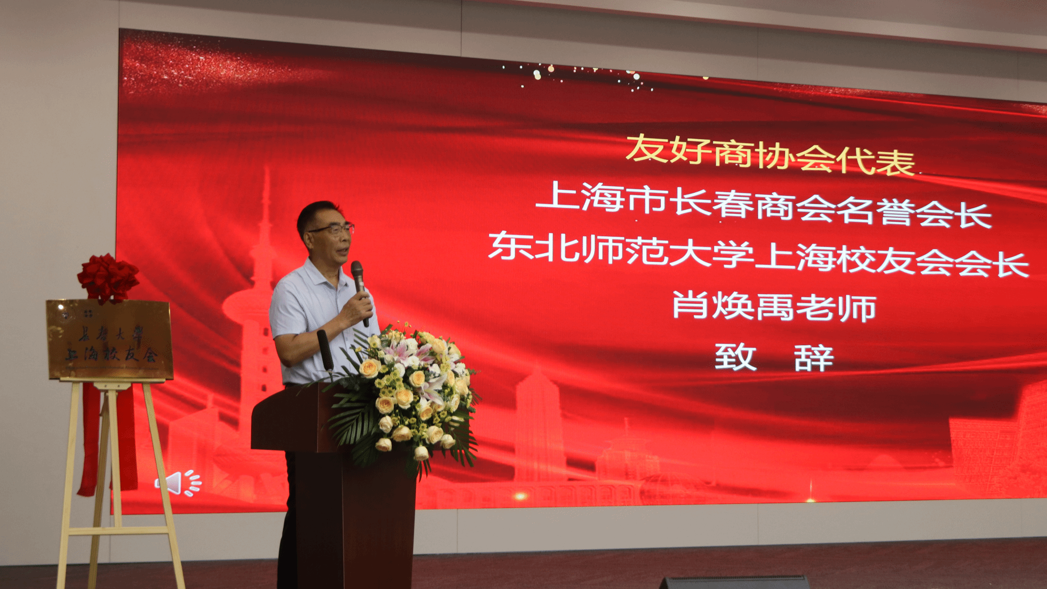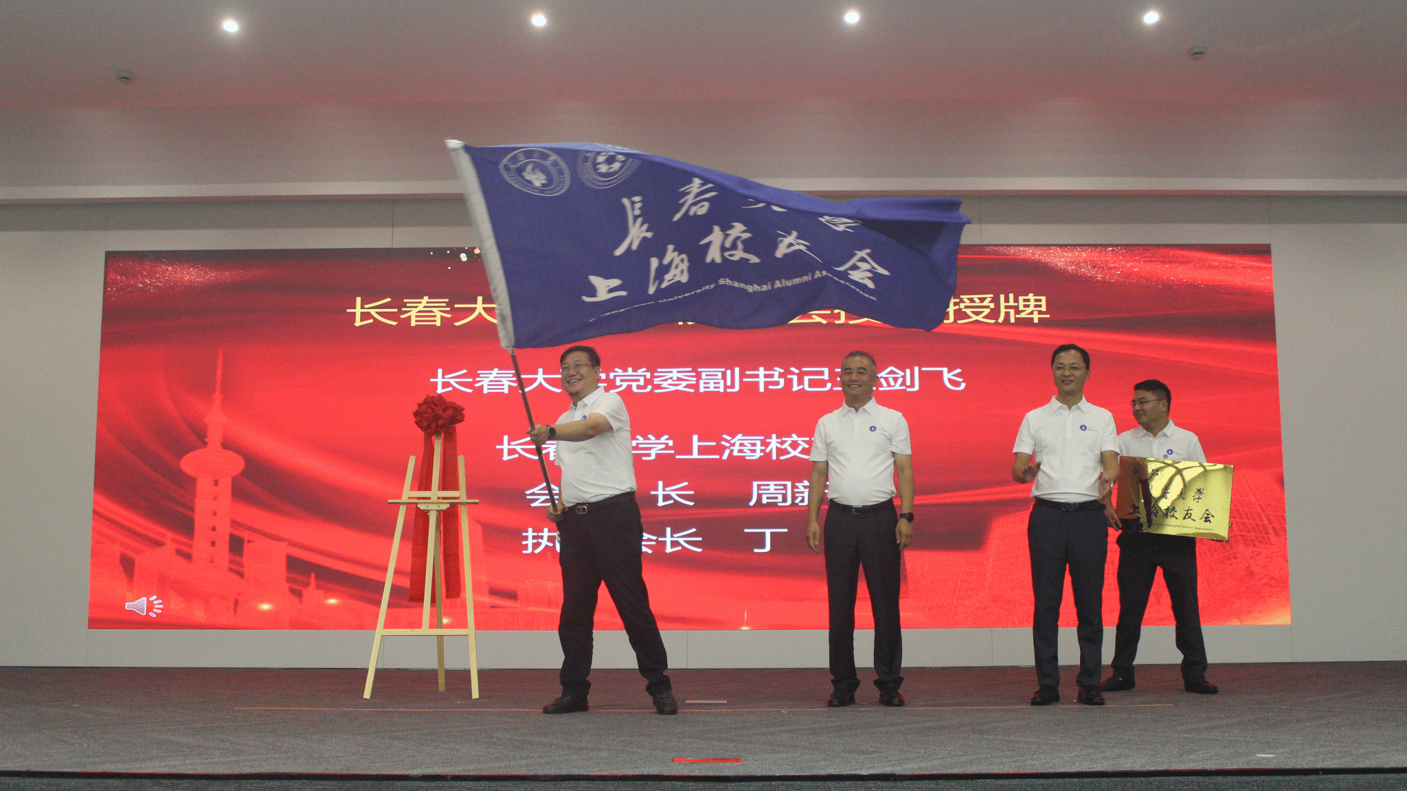 王剑飞为上海校友会揭牌、授旗。