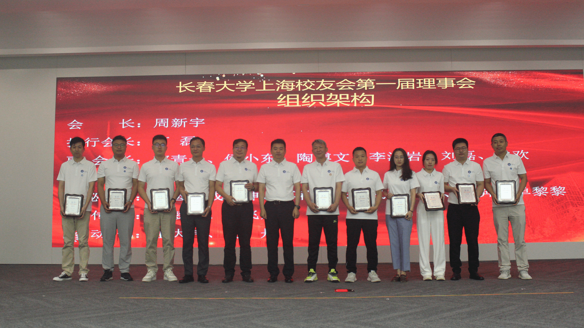 韩业为选举出的第一届上海校友会组织机构成员颁发纪念牌。