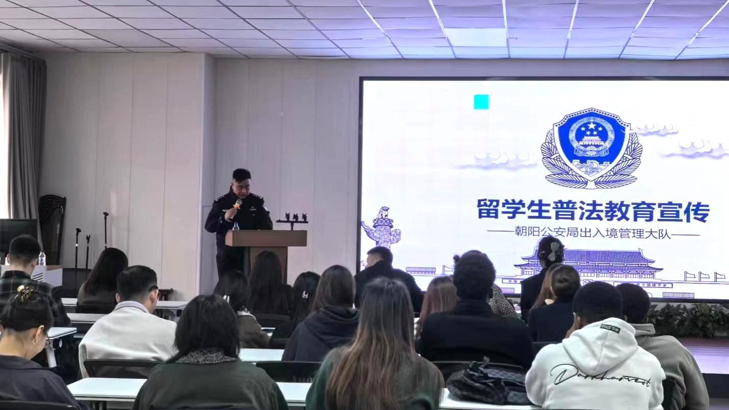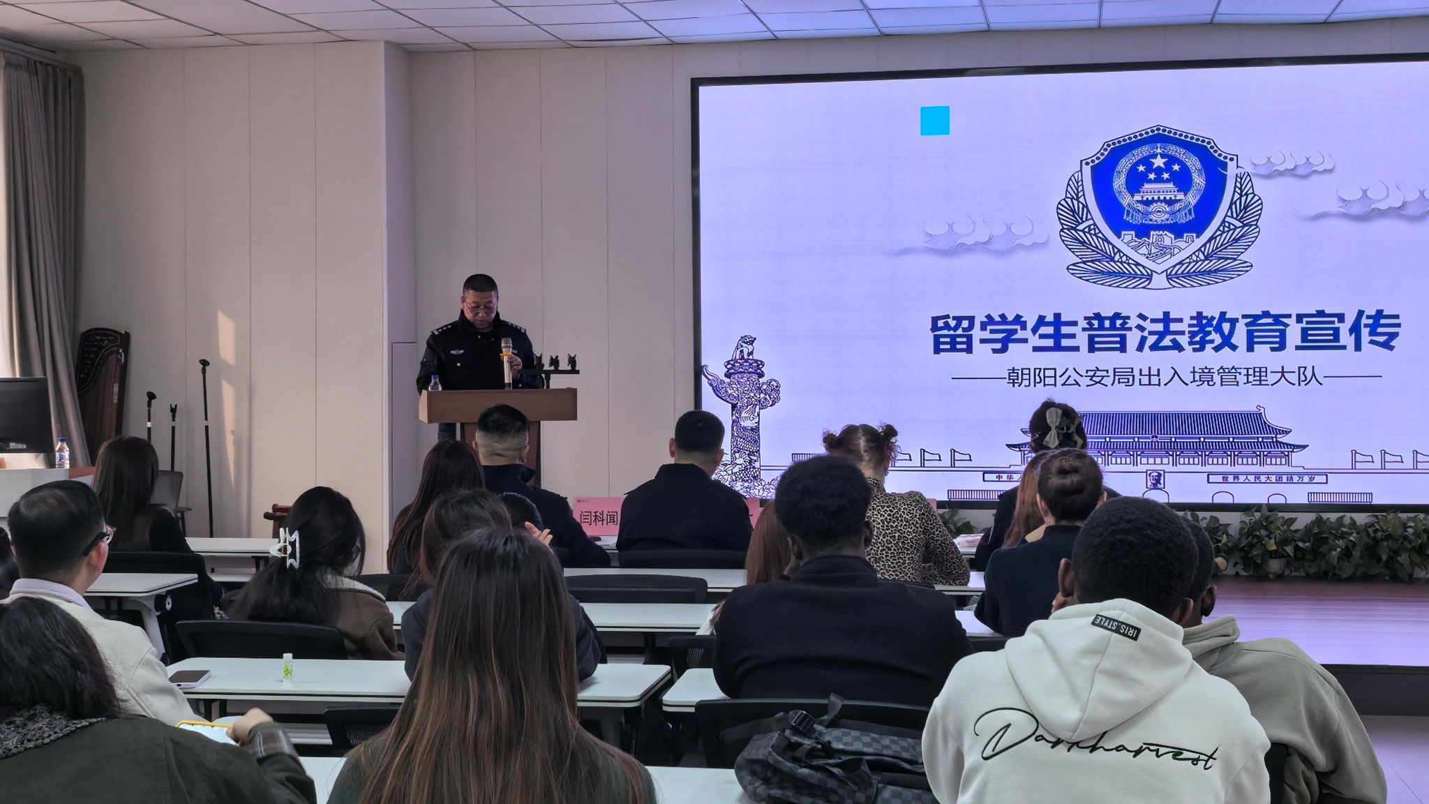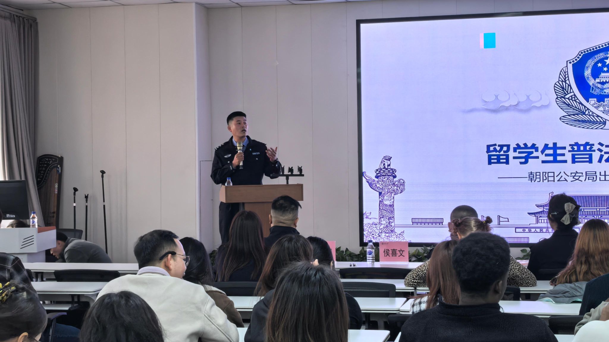 为进一步深化平安校园建设,提升我校来华留学生的法律意识、风险防范意识和安全意识,10月29日下午,国际教育学院在和鸣楼五楼报告厅举办来华留学生安全普法“第一课”专题讲座,邀请长春市朝阳公安局出入境管理大队教导员闫科闻,民警侯喜文、金立君、孙惠为来华留学生开展普法教育。