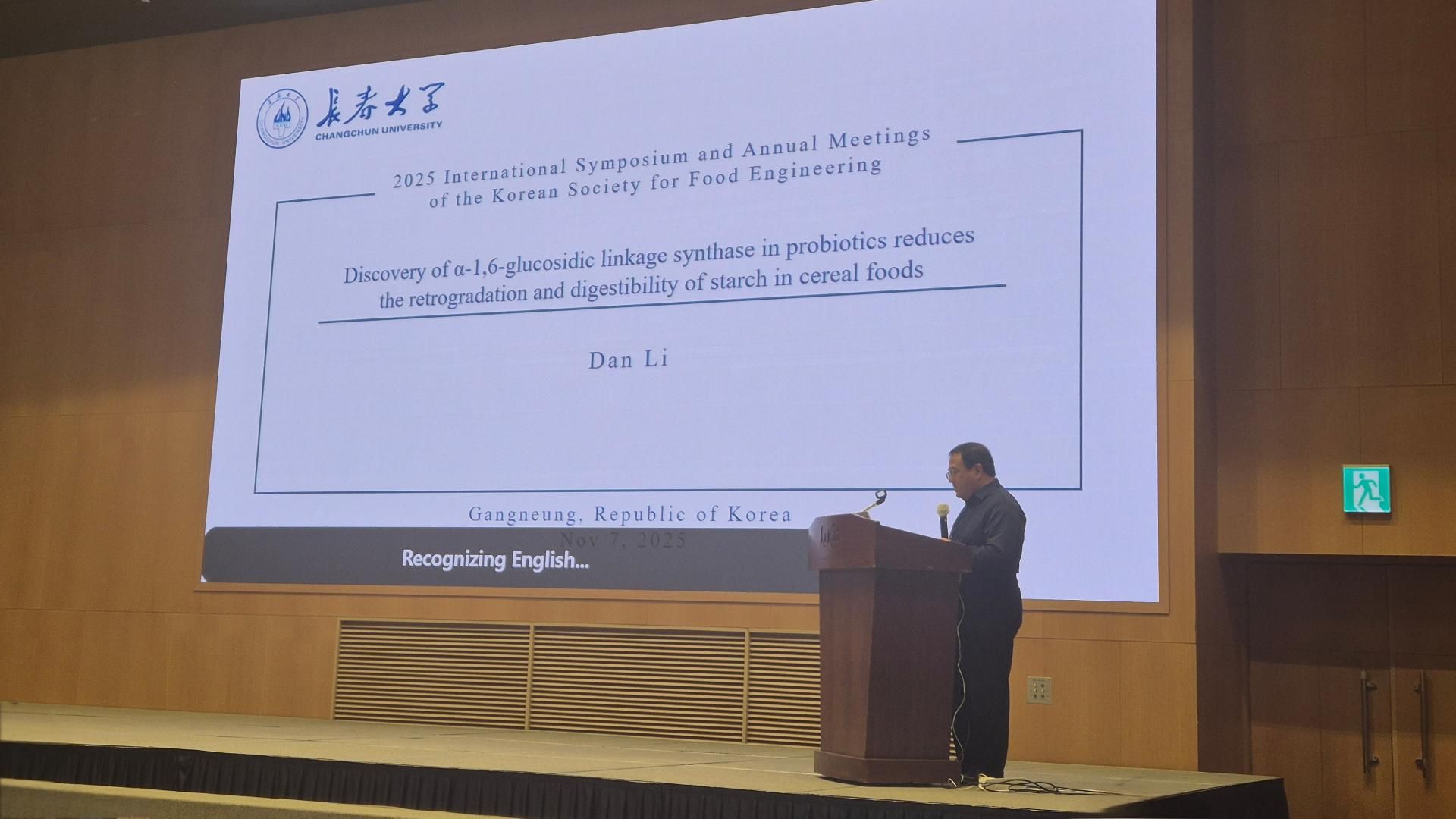 11月7日,韩国食品工程国际会议在韩国江陵市举行。会议汇集了来自多个国家食品工程领域的专家学者。我校吉林省普通高校农产品加工重点实验室李丹教授应邀作为大会发言人作了题为《Discovery of α-1,6-glucosidic linkage synthase in probiotics reduces the retrogradation and digestibility of starch in cereal foods》的学术报告。