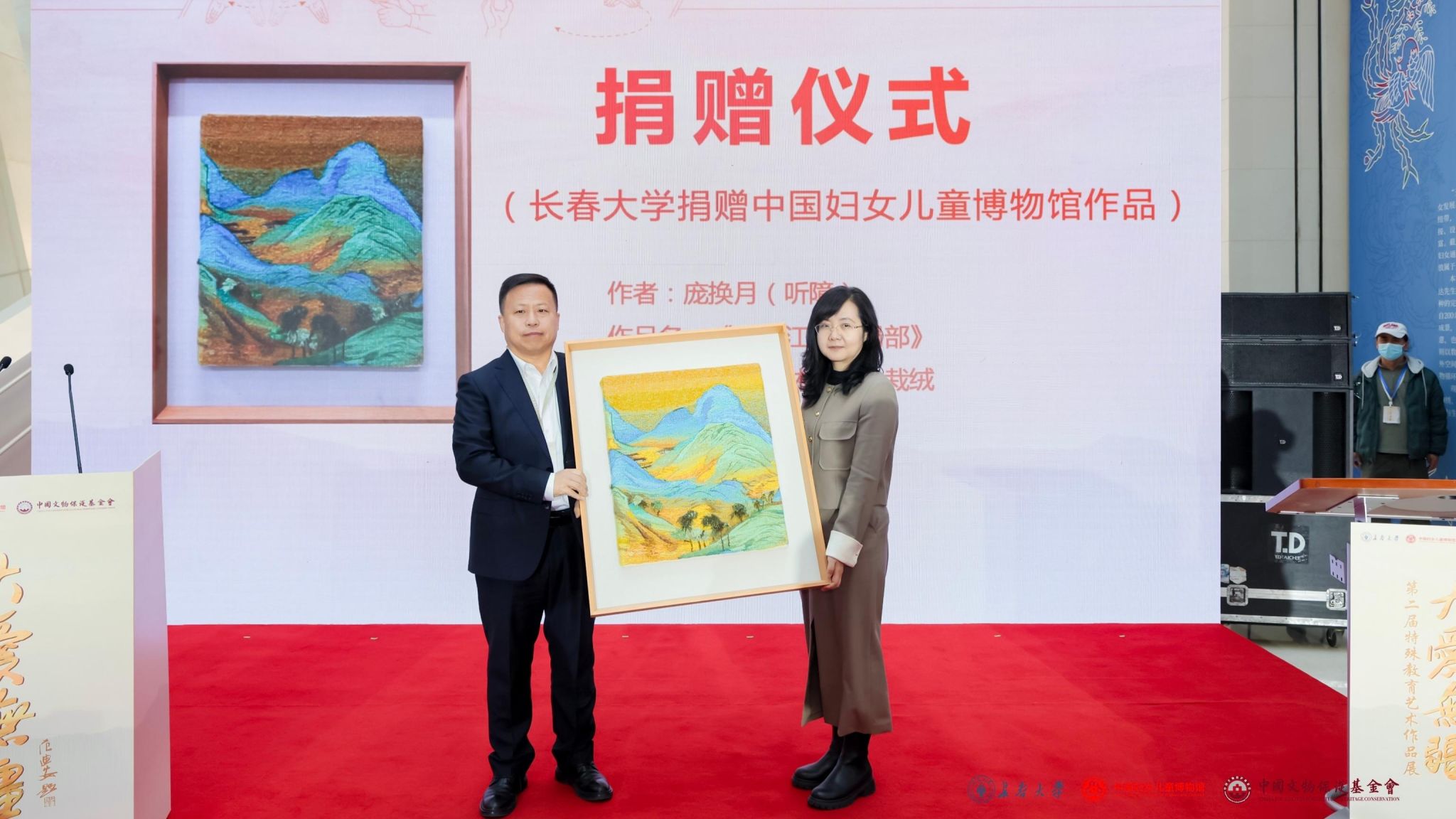 12月10日上午,由长春大学和中国妇女儿童博物馆共同主办的“大爱无疆——第二届特殊教育艺术作品展”在北京中国妇女儿童博物馆开幕。中国残疾人联合会宣文部部长王宏伟,吉林省残疾人联合会党组书记、理事长李继东,北京博物馆学会会长刘超英,中国妇女儿童博物馆馆长刘华彬,校长韩业、副校长张洪杰,中国文物保护基金会常务副秘书长初迎霞,天禹文化集团有限公司董事长张秀福,总策展人李洪波等嘉宾出席开幕活动。开幕式由特殊教育学院院长赵利军主持。