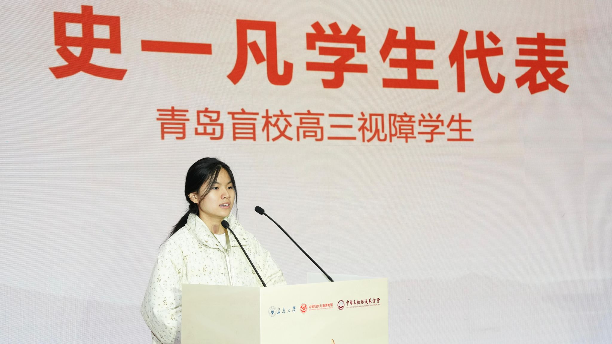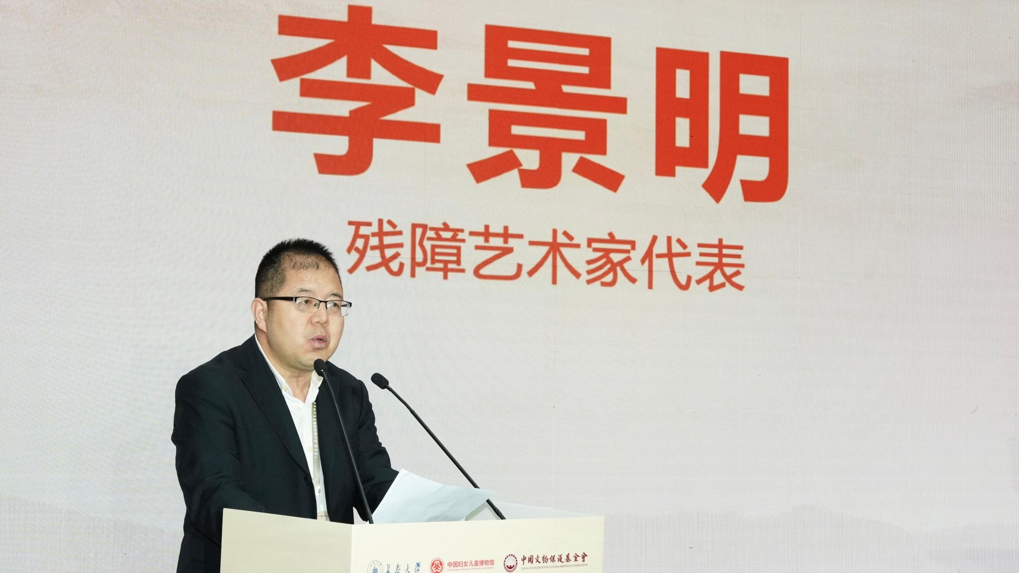 学生代表、青岛盲校高三视障学生史一凡,家长代表、刘一涵家长,残障艺术家代表李景明分别致辞。
