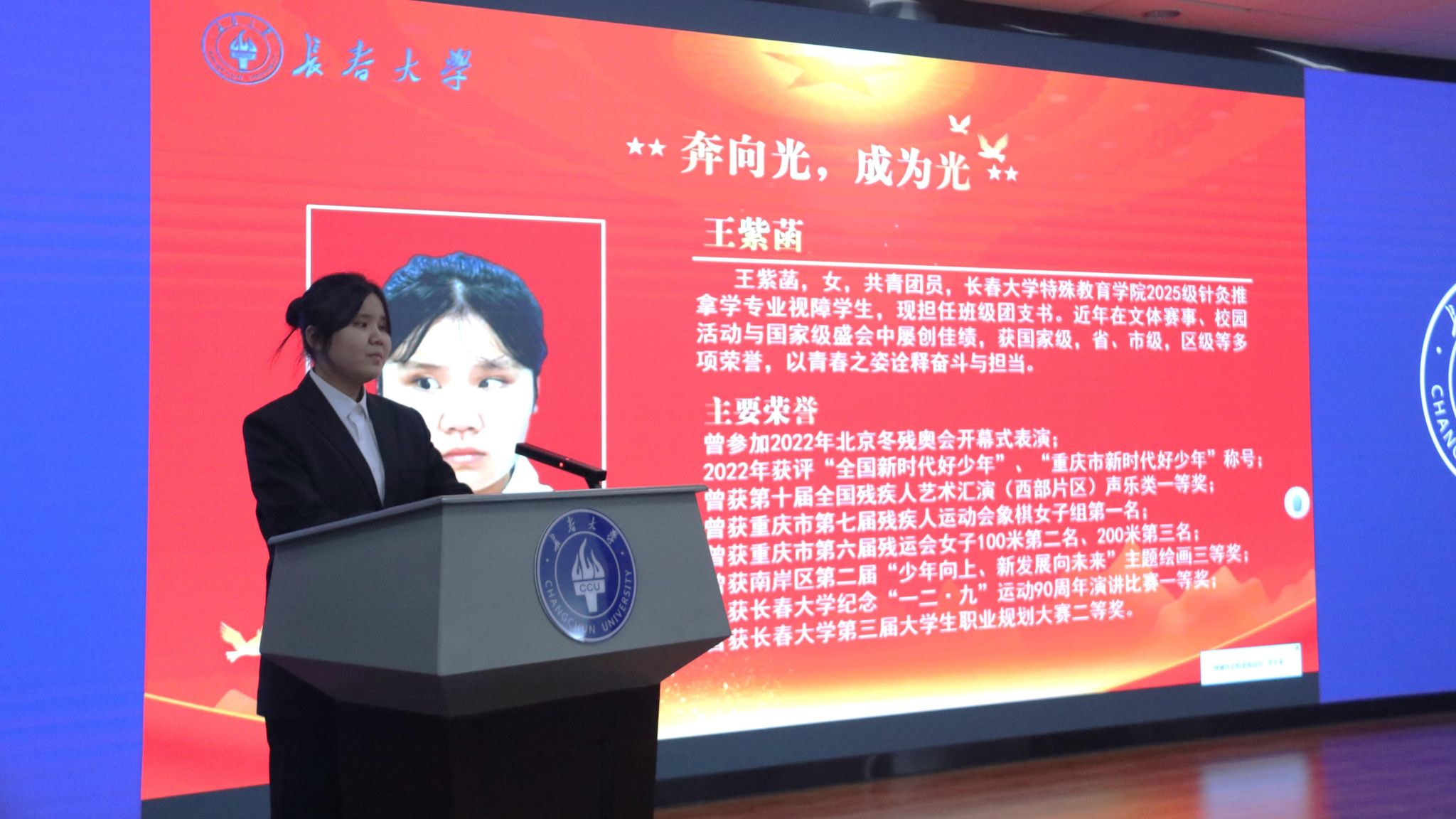 特殊教育学院学生袁浩然、史李英、张涛、孙凯诺、李佳颖、王紫菡分别分享了追逐“光音”、不负青春的成长历程。用真挚的分享、坚定的信念,展现了新时代残障青年“有理想、敢担当、能吃苦、肯奋斗”的青春风貌。