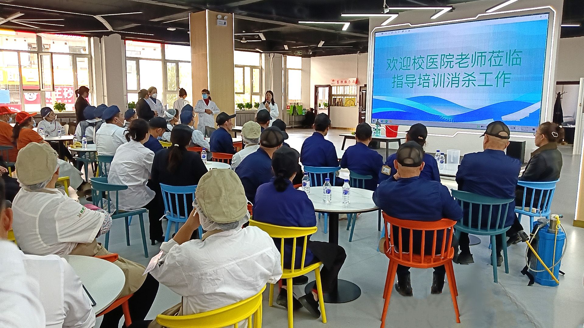为进一步做好秋季学期校园食堂安全工作,有效防控病毒传播,为广大师生营造健康、卫生、安全的就餐环境,近日,后勤保障处组织开展食堂消杀培训,邀请校医院医务人员现场进行培训指导。