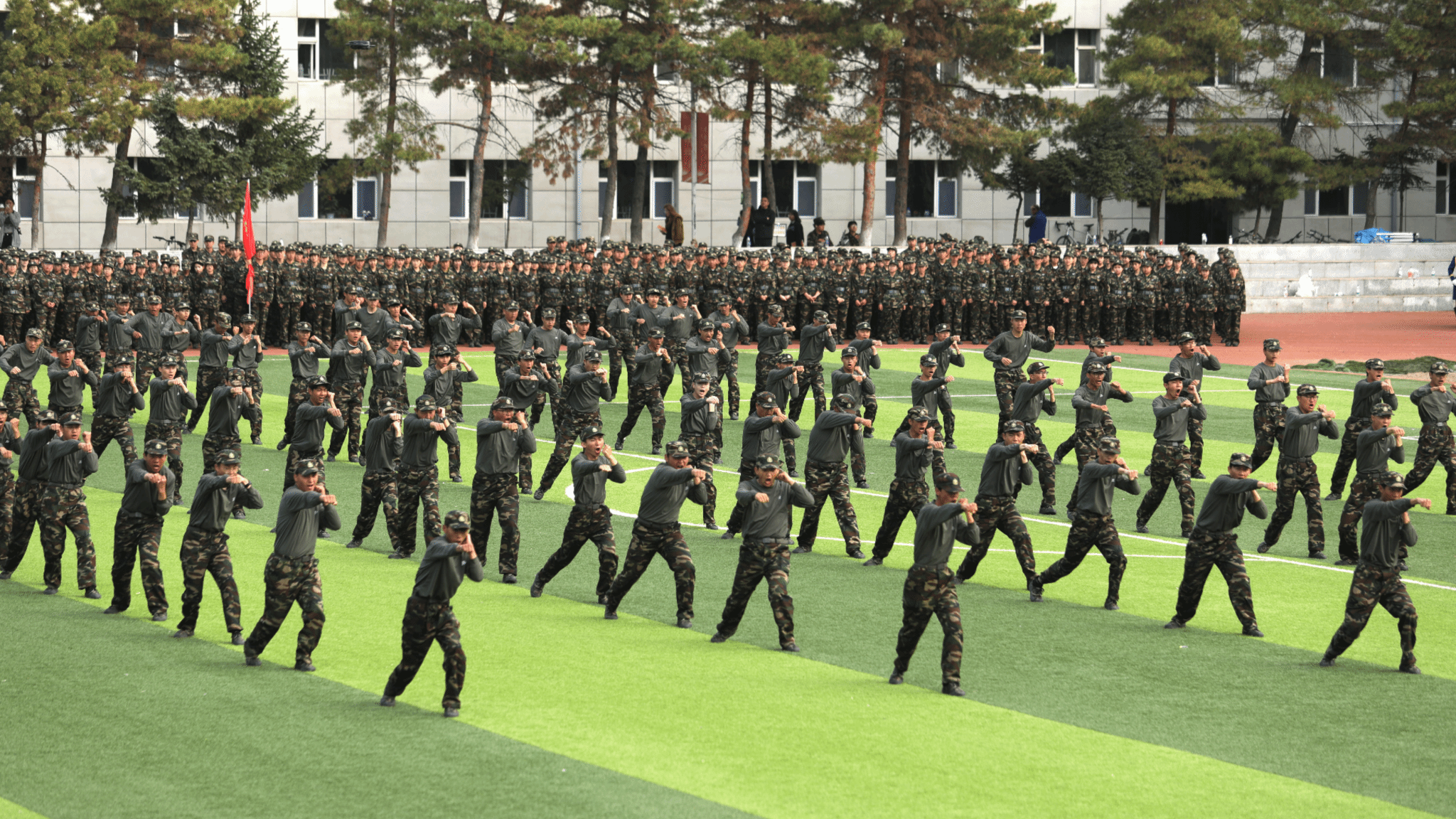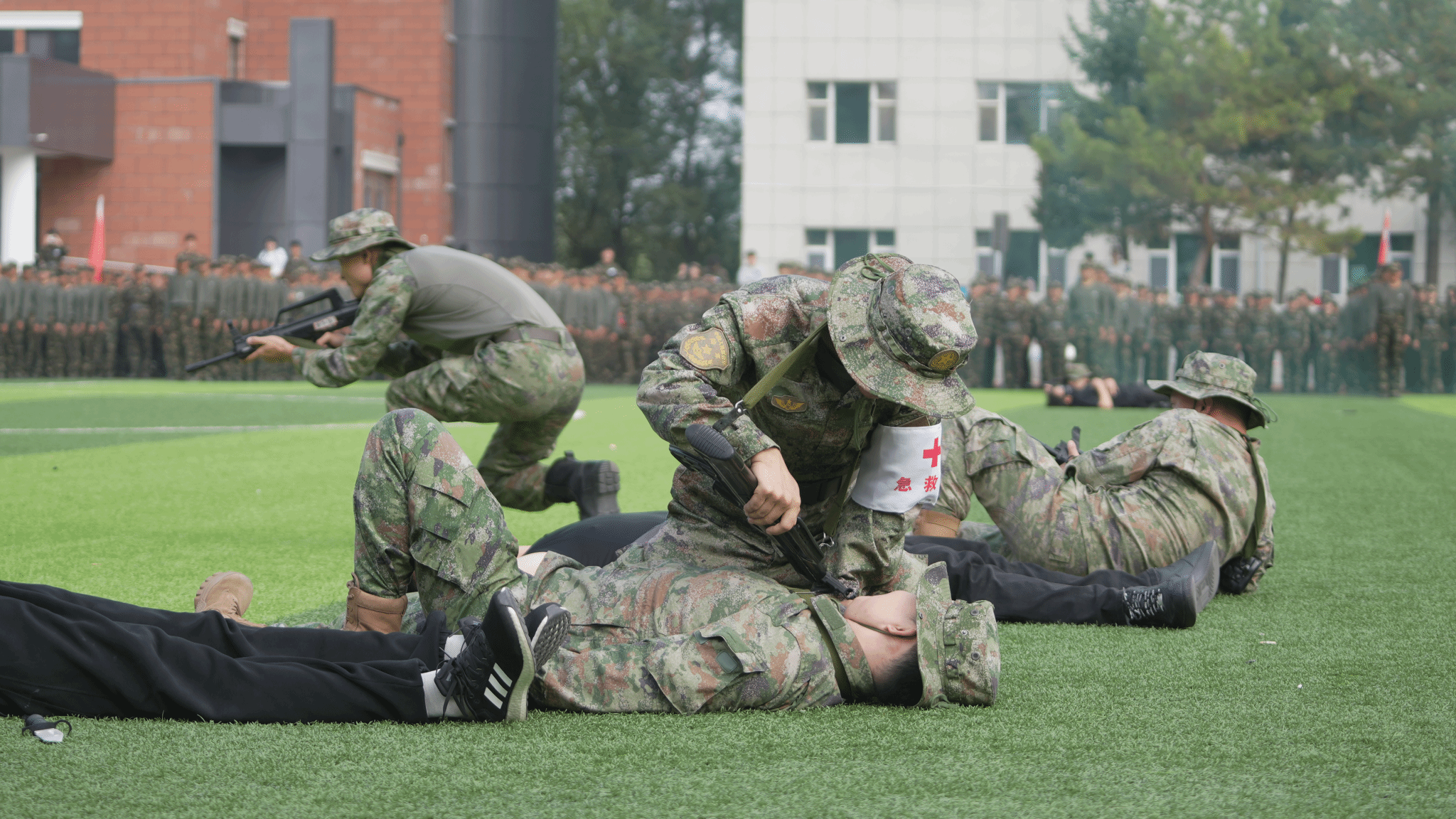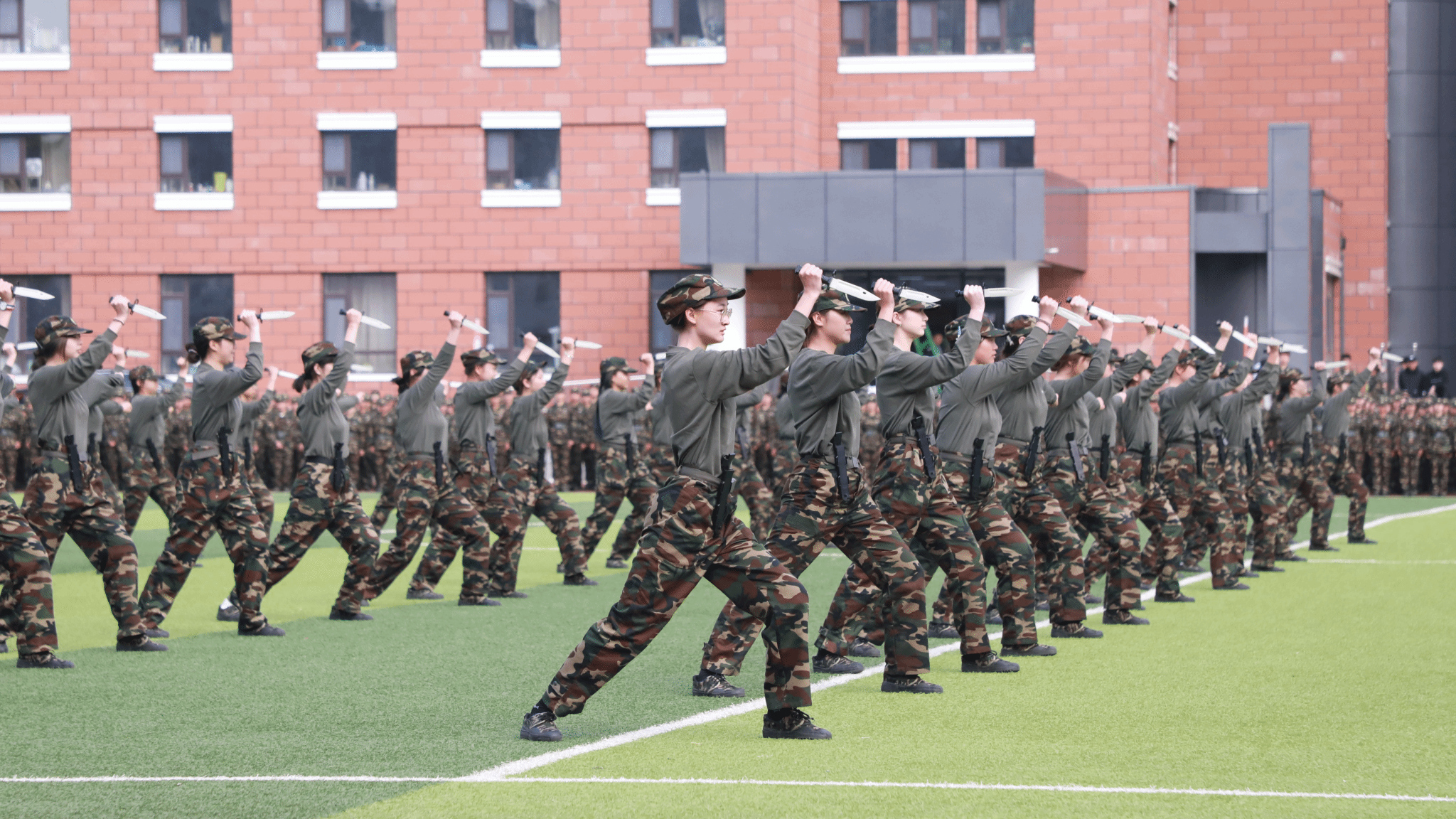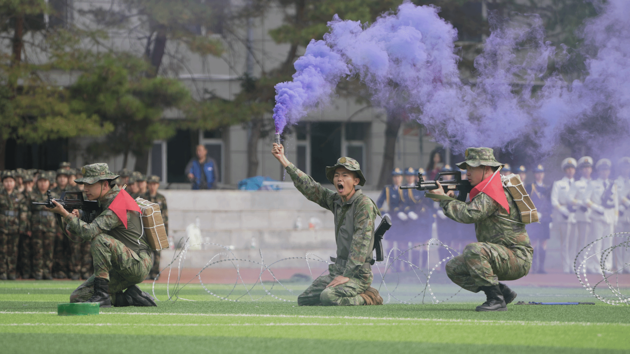 退役大学生进行了战术演练《抢滩登陆》,他们行动有素、战术精良,表现了新时代军人的英勇形象;部分新生组成的军体拳方队和匕首操方队队伍整齐、出拳有力,表现了新时代大学生的昂扬斗志。
