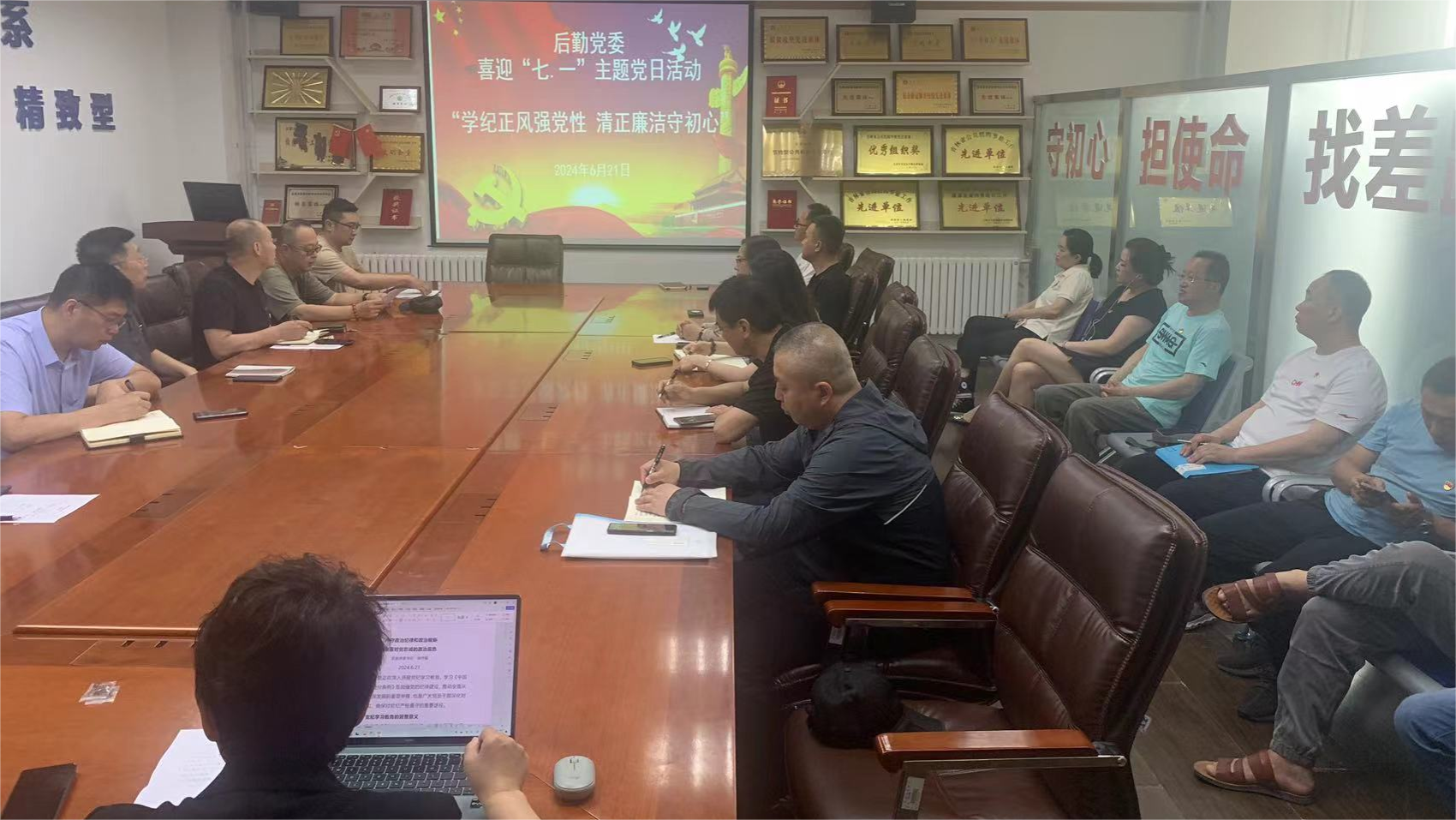 6月21日,后勤党委开展了“学纪正风强党性,清正廉洁守初心”喜迎“七一”主题党日活动。活动中,后勤党委书记徐抒毅讲了“严守政治纪律和政治规矩,永葆对党忠诚的政治底色”专题党课、全体党员重温入党誓词、收看教育微视频、表彰“优秀共产党员”和“三全育人”优秀个人。通过活动,增强了后勤党员的自豪感、使命感和责任感,全体党员表示要把党纪学习教育融入后勤服务保障日常工作,为学校事业发展奉献后勤力量。