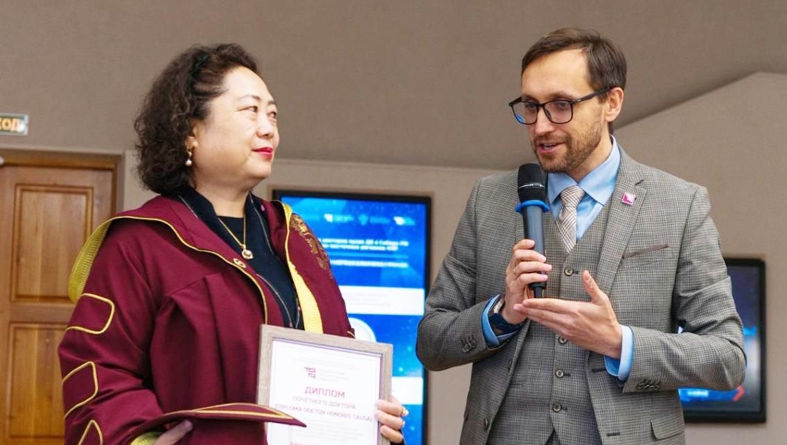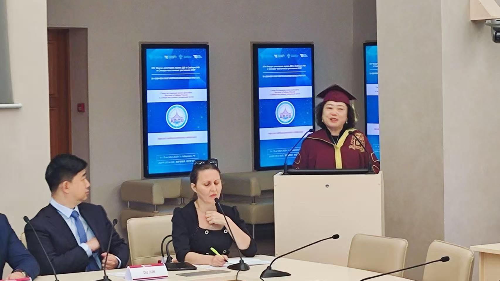 10月的长春秋意正浓,而在遥远的俄罗斯,一场跨越国界的学术致意正温暖上演。在第十四届中国东北地区与俄罗斯远东及西伯利亚地区大学校长论坛上,在54所参与大学校长论坛联盟会议的中俄高校代表见证下,我校外国语学院院长王金玲教授接过了俄罗斯太平洋国立大学授予的“荣誉博士”证书。自太平洋国立大学建校以来,仅有六位外国专家学者获此殊荣,王金玲教授便是其中之一。